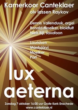 In dit programma brengt Kamerkoor Canteklaer een aantal hedendaagse werken van Morten Lauridsen, Jaako Mäntyjärvi en Ronald Moelker, cirkelend rond de thema's licht en eeuwigheid. De Latijnse uitdrukking 'lux aeterna' is afkomstig uit de requiemmis, waarin wordt gebeden om eeuwig licht voor de gestorvene(n).